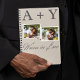 Beigefarbenes Notizbuch-Journal mit zwei kleinen Fotos mit weißem Rand, die durch eine gepunktete Thread-Zeile verbunden sind. Über den Bildern befinden sich große Serifeninitialen. Unten steht ein weiches Skript mit "Woven in Liebe" und fügt diesem verblassten Holzkohledesign eine sinnvolle Touch hinzu.