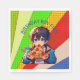 Personalisierte Geburtstagsjunge Papierservietten für eine Pizza-Geburtstagsparty. Niedlicher Anime-Junge, der ein Stück Pizza mit einem farbenfrohen Pop-Kunsthintergrund hält.