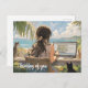 Anime-Gemälde einer Frau, die an ihrem Zuhause-Schreibtisch mit einem Laptop-Set arbeitet, an einem großen Fenster mit Blick auf den Ozean mit ihren Katzen in der Nähe. Mit generativen Algorithmen und Fotoshop erstellt.