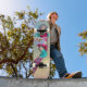 Ein niedliches Animeartmädchen mit einem Behälter der Plätzchen auf einem Skateboard.