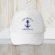 Der Hut eines Schiffskapitäns mit dem Thema Nautic, der einen klassischen marineblauen Anker mit seinem Namen und dem Namen ihres Bootes in elegantem, blau-marinebasierten Schriftsatz darstellt.