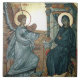 Traditionell ostorthodoxe Ikone im byzantinischen Stil gemalt. Replik aus Ei-Tempera und Goldblatt auf Holzplatte nach einem berühmten mazedonischen religiösen Gemälde aus dem 14. Jahrhundert, genannt Die Verkündigung aus Ohrid.