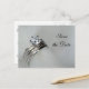 Mit der eleganten Wedding Rings Save the Date Postcard verkünden Sie Ihre nächsten Nuptials. Diese klassische individuelle Ehe behalte die Dattelkarte mit einem nahen Foto eines Diamant Verlobung Ring und Hochzeitsband Set mit weißem Tulle Hintergrund.