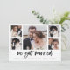 Diese einfache, schwarz-weiße Hochzeitsankündigung weist eine moderne, lässige Schriftzeichen-Typografie auf, die "wir got verheiratet", mit einem MultiFoto-Gitter von fünf Fotos auf der Vorderseite und einem weiteren auf der Rückseite. Eine stilvolle Art, Freunde und Familie lassen, wissen über Ihre Entfaltung oder dass Sie den Knoten gebunden.
