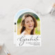 Elegante, bogenförmige Ankündigung mit dem Foto des Absolventen, "Graduate" in einer stilvollen Schrift, und ihren Namen, Klassenjahr und Schule in einfacher, moderner Typografie. Fügen Sie ein zusätzliches Foto und Ihre personalisierte Ankündigung auf der Rückseite hinzu.