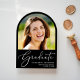 Arch-förmige Ankündigung des schwarzen Abschlusses mit dem Foto des Absolventen, "Graduate" in einer eleganten weißen Schrift, und ihren Namen, Klassenjahr und Schule oder Universität in schlichter, moderner weißer Typografie.