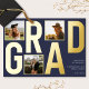 Feiern Sie Ihren Abschluss mit dieser modernen Foto Typografie Abschluss Folie Einladung. Dieses elegante Design besticht durch luxuriöse Folientypografie mit dem Wort "GRAD". Die Einladung erlaubt es Ihnen, drei Ihrer Lieblings-Fotos auf der Vorderseite zu präsentieren und so einen einzigartigen und personalisierten Sake zu schaffen. Passen Sie Ihren Namen, die Schule und den Abschluss Jahr für Jahr an, um Ihre Errungenschaften mit Freunden und Familie zu teilen. Diese Einladung eignet sich perfekt für Absolventen der High School oder der Uni und erfasst Ihren Meilenstein mit einer stilvollen marineblauen Kulisse.