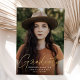 Feiern Sie den Absolvent mit unserer stilvollen Foto Abschluss Ankündigung. Die Ankündigung des Abschlusses zeigt das vertikale Foto des Absolventen mit "Graduate" in einem echten Kalligrafiebeschild-Overlay aus Goldfolie. Personalisieren Sie die Front der Ankündigung des modernen Abschlusses, indem Sie den Namen des Absolventen, den Schulnamen und das Abschluss Jahr. Die Ankündigung kehrt zu einem trendigen geometrischen Muster in Schwarz und Weiß um. Das Design eignet sich sowohl für Absolventen der Highschool als auch für Absolventen der Uni.