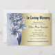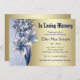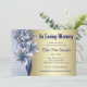 Schöne königliche blau und goldblau mit babyblauen Blume und Wirbel personalisierte Beerdigung und Gedenkankündigung und Einladungsvorlage. Diese wunderschöne blaue Gedenkankündigung und Begräbnisankündigung lässt sich leicht an Ihre Veranstaltung anpassen, indem Sie einfach den Button "Anpassen Sie es!" auswählen, um Ihre Veranstaltungsdetails, den Stil des Schriftartes, die Größe des Schriftartes und die Schriftart und den Wortlaut hinzuzufügen. Bitte beachten Sie - alle Aufkleber, Karten und Einladungsdesigns, die Sie auf Zazzle finden, sind gedruckte Grafiken ohne wirkliche Juwelen, Bögen, Aufhängungen, Prägungen oder Zusatzteile. com