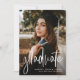 Feiern Sie Ihren Uni- oder Gymnasialabsolventen mit dieser vertikalen Ankündigung eines Fotos, die auch Platz auf der Rückseite für die Abschlussfeier beinhaltet. Das moderne Drehbuch "graduate" auf der Vorderseite in Weiß ist perfekt für einen trendigen Abschluss. Der Backer ist marineblau mit einem subtilen Muster, aber die Farbe kann durch Klicken auf "Anpassen" in jede Schulfarbe geändert werden.
