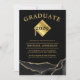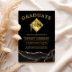 Trendy 2025 Abschluss-Ankündigungskarte mit schwarzem Hintergrund mit goldenem Glitzer-Muster, einem Motboard mit dem Klassenjahr oben, dem Namen der Schüler und ihren Zukunftsplänen.