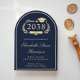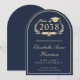 Formal bogenförmige, dunkelblaue Uni-Abschluß-Ankündigung mit "Class of" in einer goldenen Illustration eines klassischen Lorbeerkranzes mit Graduiertenkappe und Diplom und dem Namen des Absolventen in einem eleganten, hellen Goldskript. Fügen Sie ihre Schule, Dur, Ehren oder zukünftige Pläne in einfachen modernen Gold Typografie.