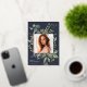 Unsere Eukalyptus & Sage Abschluss Ankündigung bildet ein Foto Ihres Absolventen mit einem eleganten quadratischen Rahmen von üppigen Aquarelleukalyptus und Salbei-grünen Blätter, mit echten Goldfolien-Trimm auf einem dunkelblauen Hintergrund. Personalisieren Sie das Unterrichtsjahr, den Namen und die Schule Ihres Absolventen. Fügen Sie der Rückseite eine persönliche Nachricht und ein zusätzliches Foto hinzu.