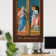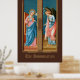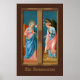 " ℣. Der Engel des Herrn verkündete Maria, ℟. Und sie dachte sich den Heiligen Geist aus." So beginnt der Angelus das dreitägige Gebet der Kirche an die gesegnete Jungfrau Mary (BVM), die an die Inkarnation bei der Verkündigung erinnert. + Die Ankündigung war ein sehr beliebtes Thema in der Kunst des Mittelalters und der Renaissance. Als Zwei-Personen-Komposition lieh sich das Subjekt an den äußeren Blätter des Triptychons: der Engel auf dem einen Blatt; Maria auf dem anderen. Ein Triptychon ist ein Kunstwerk - meistens ein Panelgemälde - das aus drei Teilen besteht, die so zusammengeschoben werden, dass es offen oder gefaltet geschlossen dargestellt werden kann. + Hier, Filippo Lippi (1406-1469) hat die Verkündigung in Tempera auf Holz in warmen Rosa, Salmonen, Rot und in brillanter und dunkler Blues gemalt. Beide Figuren stehen in ihren engen jeweiligen Räumen, der Erzengel Gabriel beugt sich leicht der sanften und süßen Maiden Mary. + Saints_Alots mag einen dunkelbraunen Hintergrund für dieses Bild. Ein dunkelbrauner Hintergrund vermittelt dem Betrachter den Eindruck, dass er die Szene durch ein Fenster beobachten kann. Aber wie üblich haben wir auch eine Farbpalettenpostkarte für andere empfohlene Farbtöne zur Verfügung gestellt. + Feier der Verkündung: März 25; Fest des hl. Gabriel der Erzengel: 29. September + Bildkredit (M 038): Antiquitätenbild der Ankündigung von Filippo Lippi (1406-1469) aus einer Postkarte aus dem späten 19. bis frühen 20. Jahrhundert Die von E. Sborgi, Florenz, Italien, erschienene Schrift stammt aus der privaten Sammlung religiöser Ephemerien des Designers. Die Originalpaneele aus einem Polyptychon unbekannten Ursprungs befinden sich im Filippo- und philippinischen Saal der Uffizi Galerie in Florenz. Die Annunziation bildet die obere Hälfte der beiden Blätter während SS. Anthony Abbott und John the Baptist erscheinen auf der unteren links bzw. unteren rechten.