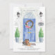 Mit unserer stilvollen Ankündigung kündigen Sie Ihre neue Adresse an: Yorkshire Terrier, blaue Haustür, Begrüßungstafel, Schild mit Schiefer, Topiaries und ein Set mit Blumenkranz auf grauem Backstein.