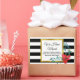 Sie können schwarzen Text mit Ihrem Namen und Ihrer neuen Adresse personalisieren. Im benutzerdefinierten Textfeld steht "Wir haben uns bewegt" über Name und Adresse. Der Hintergrund weist horizontale schwarz-weiße Streifen auf. Eine rote Blume ist in der unteren Ecke.