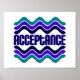 Eine farbenfrohe Grafik von lila, blau und aquamarin zeigt das Wort ACCEPTANCE in der Mitte. "Akzeptanz" ist der Eckpfeiler der erfolgreichen Erholung in jedem 12-stufigen Programm wie Alcoholics Anonymous, Narcotics Anonymous, Al Anon.
