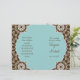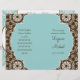 Un programme de mariage charmant et romantique pour la mariée qui penche vers le contemporain avec une petite touche de tradition. Le motif damassé blanc a une allure de dentelle moderne et le centre de quatrefoil est décalé et amusant! Aqua bleu, chocolat brun et blanc est un très beau mélange de couleurs. Cette invitation peut être créée dans n'importe quelle combinaison de couleurs que vous souhaitez. Tout ce dont nous avons besoin, c'est d'un échantillon de couleur et nous sommes heureux de le mettre en place pour vous, envoyez-nous un courriel. RECOMMANDATION SUR PAPIER : À moins que vous ne vouliez que ces notes professionnelles et pliées dans un atelier d'impression, je recommande la sélection de papier de valeur qui est fini mat. Le papier de base est brillant à l'extérieur et peut craquer avec des couleurs foncées à la tache de pliage.