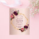 Sur le devant : Une invitation pour une fête d'anniversaire de 50e (ou tout âge). Un élégant et tendance rose d'or faux métallique à l'aspect arrière - plan avec un cadre géométrique en faux or. Décoré de fleurs violettes foncées et bordeaux, de plumes roses et boho. Modèles pour un nom et les détails de la fête. Le nom est écrit avec un script de style écrit à la main, des lettres de couleur violette. Dos : rose or faux métallique à l'aspect arrière - plan. Conseil : Si vous ne voulez pas qu'il ressemble à une carte postale, cliquez sur customiser, allez à l'arrière et retirez le séparateur et le timbre postal.