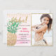 Carte d'invitation d'anniversaire tropicale avec photo personnalisée, cadre de Parties scintillant d'or, lumières à cordes et ananas tropique d'or