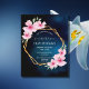 Une invitation à la fête d'anniversaire de 50ème (ou tout âge) à la flore tropicale, aux fleurs d'hibiscus roses, à la verdure et à un cadre géométrique en faux or. Un ciel de nuit bleu foncé comme arrière - plan. Modèles pour un nom écrit avec un script moderne de style manuscrit, modèles pour vos informations de fête. Texte blanc. Parfait pour un été, une piscine ou une fête de plage ! Retour : carte postale ordinaire. Conseil : Si vous ne voulez pas qu'il ressemble à une carte postale, cliquez sur customiser, allez à l'arrière et retirez le séparateur et le timbre postal.