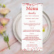 Carte menu fête d'anniversaire. Personnalisez et ajoutez un nom, un âge, une date et le menu. Un arrière - plan blanc. Décoré de confettis rouges, texte rouge. Retour : ajoutez une photo de la fille d'anniversaire, des faits amusants et des noms.