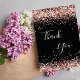 Un carte de remerciements d'anniversaire féminin et élégant. Une couleur noire arrière - plan. Avec des confettis en or rose. Sur l'avant grand main écriture et le texte : Merci. Retour : Personnalisez et ajoutez Votre note de remerciement et votre nom. Le nom est écrit avec un script de style moderne écrit à la main.