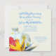 Einladungen auf Platz mit hawaiianischem Blumendesign. Beispieltext ist für eine erneuernde Versprechungszeremonie zur Feier eines Meilenstein-Jubiläums. Blauer, moderner Script-Schriftart wird mit Großbuchstaben gedruckt und mit einem Ort für Empfang Adresse / Ort / Information gepaart. Paradies, weiße Plumeria und Blume aus Hibiskus schmücken die untere links Ecke.