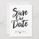 Cette conception présente les mots "save the date" en caractères gras noirs manuscrits. Les noms des conjoints et les détails du mariage sont affichés ci-dessous et peuvent être personnalisés.