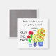 Ein schicker, individualisierbarer "Save the Date"-Kühlschrankmagnet mit drei Töpfen, voller farbenfroher Blume, aus einer handbemalten Papiercollage von Judy Adamson