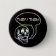 Ein Vintag inspiriert Schädel spricht für Sie Ihre angepassten Pronomen. Ein LGBTQIA+ Regenbogenschatten erzeugt einen 3D-Holoeffekt. Das Design ist besonders während der schönen Halbjahreszeit geeignet!