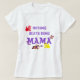 Niedliche, farbenfrohe Gestaltung zeigt den Satz "Nichts schlägt vor, Mama zu sein" in lila Schrift vorne, umgeben von Bonbons, Fingerabdrücken, Spielzeug etc. Reverse lautet: "Aber Schokolade hilft!" mit Bildern von Schokolade rund um die Formulierung. Perfekt für die Mama eines Kleinkind!