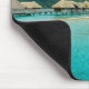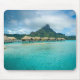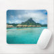 Mousepad mit einem Luxusoverwater Strohdach-Bungalowerholungsort in einem Ferienort in der klaren blauen Lagune mit einer Ansicht über die tropische Insel von Bora Bora, nahe Tahiti, im Französisch-Polynesien.