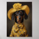 Elegante schicke Dackel im Stil des niederländischen Malers Frans Hals. Niedlicher Hund mit gelbem Kleid und Hut mit gelben Blumen