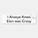 "I Always Knew Elon Was Crazy" - a bumper sticker for people who don't own Teslas.