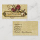 Vintager Papierhintergrund, ein altmodischer Aufkleber verziert mit getrockneten Blumen und ein Gold- und Roterbogen, plus metallische Strudeldekorationen. Eine klassische Blick-Visitenkarte mit einem eleganten, nostalgischen Blick.