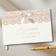 Personalisieren Sie dieses elegante Spitze-Hochzeitsgästebuch, inspiriert von der Regency-Ära, mit einem charmanten Bridgerton-Thema. Dieses elegante Erinnerungsstück zeigt beige Spitze, verziert mit zarten rosa-beigen Perlen vor einem vintage-elfenbeinfarbenen Hintergrund. Ein wunderschönes Satinband in staubigem Rosa fügt einen Hauch von Eleganz hinzu und unterstreicht den vintage-femininen Charme. Perfekt für herzliche Botschaften, ist dieses Hochzeitsgästebuch mit einer schönen Folien-Kalligrafie-Schriftart eine exquisite Ergänzung für jede anspruchsvolle Hochzeitsfeier. Eine zeitlose Mischung aus Eleganz und Charme, die eine unvergessliche Erinnerung für jede Braut darstellt, die den romantischen Geist einer vergangenen Ära verkörpert.