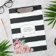 Elegante und schicke Zwischenablage mit breiten, horizontalen Streifen in rauchig-schwarz-weiß, mit einem Haufen von rot-rosa Aquarellbeinen und schlängelgrünen Blätter, die aus der unteren links Ecke blühen. Personalisieren Sie Ihren Namen, Ihre Monografie, Ihre Marke oder Ihren Firmennamen in der Mitte. Stilvolles Blumendesign wiederholt sich auf der Rückseite.