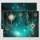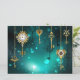 Gold, antike Schlüssel mit Gängen und Dials hängen an goldenen Ketten auf leuchtend grünem Hintergrund.