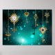 Gold, antike Schlüssel mit Gängen und Dials hängen an goldenen Ketten auf leuchtend grünem Hintergrund.