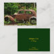 Diese Kunsthandwerkskarte verfügt über einen schlechten Junker-Jalopy, der verlassen ist, im Wald zu rosten. Es ist von grünen Bäumen und weißen Wildblumen umgeben. Dieses alte, rostige Orange-, Braun- und Blauweinauto hat eine gewisse Schönheit und Würde.