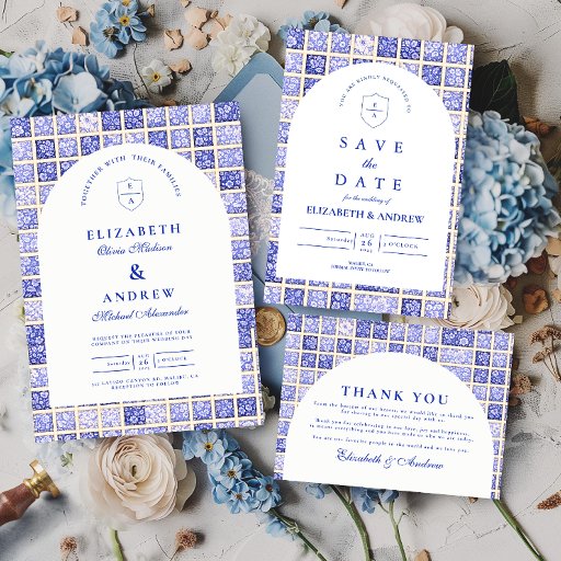 Ein zeitloses blau-weißes Design, inspiriert von klassischem Delfter Porzellan und französischen Toile-Mustern. Der Patchwork-Fliesenrand kombiniert zarte Blumenmuster, Streifen und ornamentale Motive, die an europäische Vintage-Keramik erinnern. Ein weiches, gebogenes Paneel in der Mitte hält das Layout elegant und raffiniert und lässt die Details des Porzellan-inspirierten Musters die Feier schön umrahmen. Perfekt für Paare, die eine anspruchsvolle blau-weiße Hochzeit mit traditionellem europäischen Charme planen.