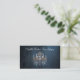 Elegante, dunkelblaue Visitenkarte mit einem antiken Kronleuchter mit goldenen Details und blauen Prismen. Die Farbe ist auf der Rückseite mit allen Kontaktdaten hellblau.