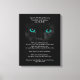 Diese schöne Apache Hochzeit Segen, die mit "jetzt wirst du keinen Regen spüren. mit einer schwarzen Katze mit türkisfarbenen Augen, die dir weißen Text und schwarzen Hintergrund anschauen.