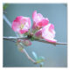 Ein Foto eines Apfelzweiges mit rosa Apfelblüten auf blauem/grauem Hintergrund.