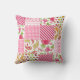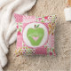 Un coussin pour des professeurs comportant une illustration d'une pomme verte décorée d'un coeur rose et d'un texte blanc "PROFESSEUR." L'arrière - plan est une conception inspirée par patchwork girly se composant des motifs de point de polka, de Paisley, de rayures, de zigzag, floraux, et de guingan.