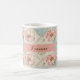 A floral applique patchwork pattern with pink and ivory flowers roughly stitched onto blue and ivory fabric, with worn, ecru lace gives this mug a shabby and chic look that you will love. Resembles and old quilt, forgotten in an attic. Very feminine, perfect for anyone who loves stitching.