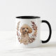 Ein hübscher Herbstkranz in den Farben Zimtbraun, Bräune und Creme umgibt das Aquarellbild eines zauberhaften Aprikosenkuchens. Das Bild wird zweimal auf der Tasse gedruckt, wobei der eigene Text dazwischen liegt.