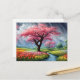 Eine lebendige Landschaft mit Frühlingsbäumen entfaltet sich in einer stürmischen Szene mit bewölktem Himmel. Ein nasser Weg durch blühende Felder mit Frühlingsblumen lädt zu einem Spaziergang ein.