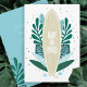 Surf ! Baby shower tropical à thème surf invitation avec une planche de surf à grains de bois naturel et des feuilles tropicaux dans les tons bleu et vert aqua.